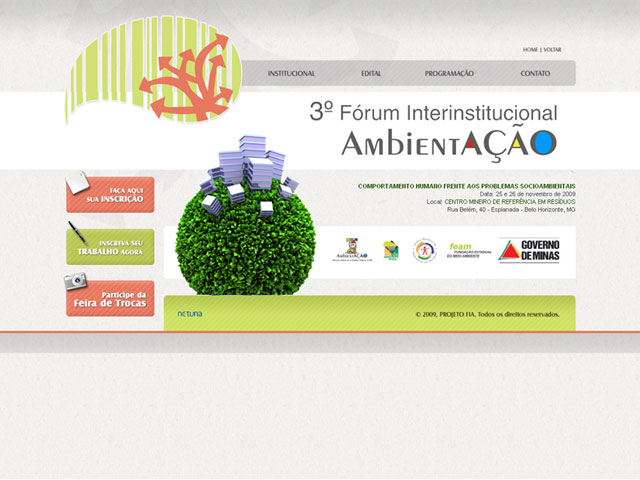 Criação do site FIA 2009 O FIA 2009, o 3º Fórum Interinstitucional Ambientação foi um evento ocorrido nos dias 25 e 26 de novembro de 2009 e teve coo cidade sede Belo horizonte. O evento visava discutir o comportamento humano frente aos problemas sócio ambientais. A netuna foi chamada para a elaboração do hotsite, peça […]
