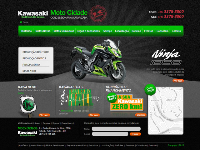 Criação do site MOTOCIDADE A Moto Cidade comercializa motos, consórcio, peças e serviços da marca KAWASAKI. O seu diretor-proprietário é o Sr. Altair Fidelis Ramlow,conhecido como Du, empresário capixaba, que está há mais de 20 anos no mercado motociclistico e em 2009 se tornou concessionário autorizado Kawasaki.Para a moto cidade a netuna criou um website […]