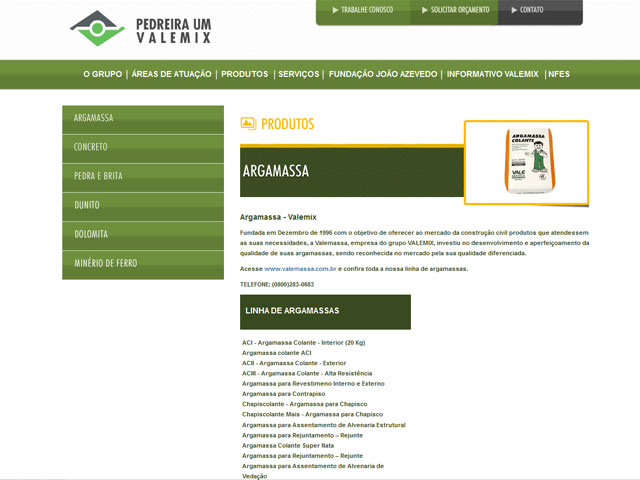 Criação do site VALEMIX O Grupo Pedreira Um Valemix, conta com uma forte presença no ramo de construção civil no leste mineiro, atuando principalmente no fornecimento de agregados, concreto usinado e argamassas industrializadas. O grupo atua fortemente também de extração e fornecimento de minerais para as siderurgias de todo Brasil. Os principais minerais comercializados pelo […]