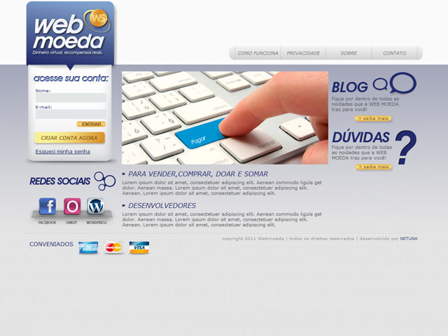 Criação do site WEBMOEDA O webmoeda é o mais novo Gateway de pagamentos que esta em fase de testes para alçar voo no grande mercado de pagamentos on-line. Através de um modelo que tem bases tradicionais e inovações mercadológicas , o webmoeda promete ser um site de sucesso. A netuna teve a função de criar […]