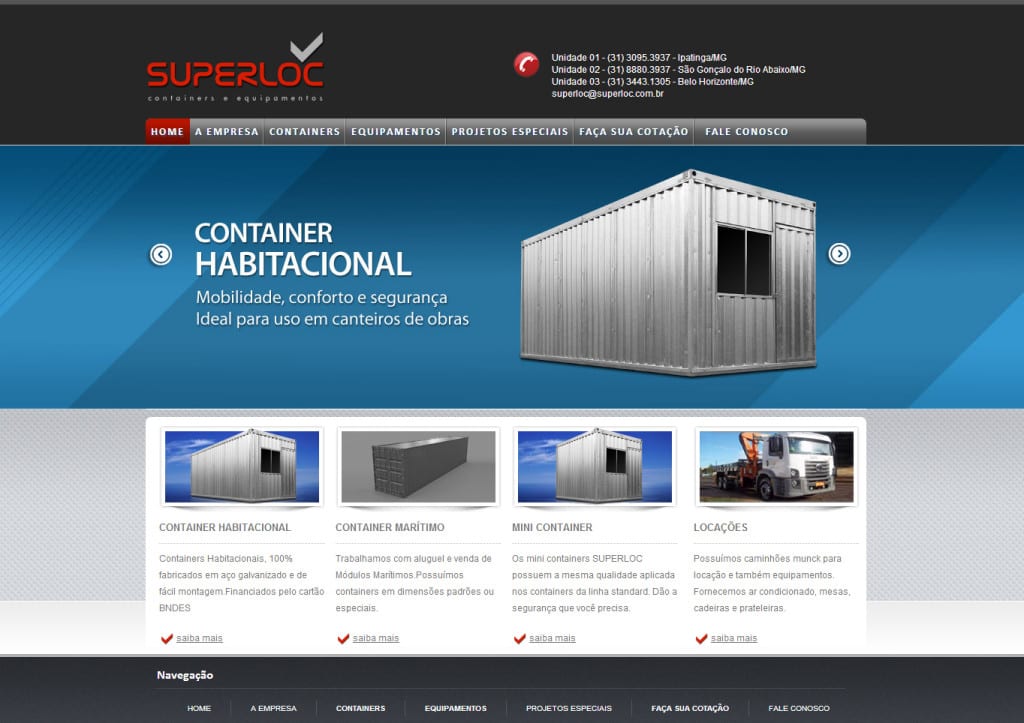 Criação do site SUPERLOC A SUPERLOC containers e equipamentos, foi criada e estabelecida em julho de 2008 vislumbrando o crescimento urbano e do parque industrial da região do Vale do Aço – Minas Gerais. criação de sites bh criação de websites criação de sites wordpress Website SUPERLOC