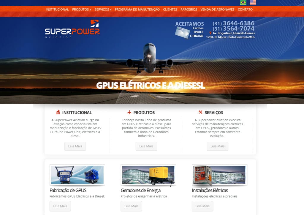 Criação do site SUPERPOWER A Super Power Aviation é uma Empresa inovadora no ramo Aeronáutico e de Energia Alternativa, especialista em Fabricação e manutenção de fontes externas para partidas e manutenções em Aeronaves – GPU ( Ground Power Unit) e produtos em geral de apoio ao solo aeronáutico. Trabalhamos também com fabricação, manutenção,locação e vendas […]