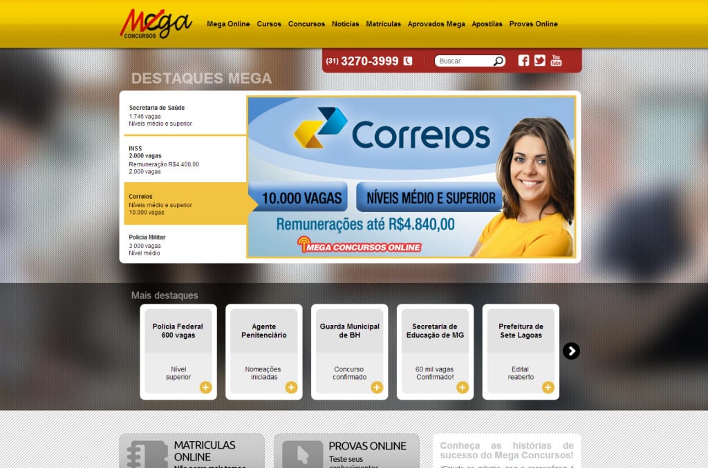 Criação do site MEGA CONCURSOS O Mega Concursos foi fundado no ano de 2000, época em que oferecia a seu alunado cursos supletivos e preparatórios para concursos públicos. Com a firme proposta de preparar sempre com excelência, o Mega tornou-se referência de mercado, firmando-se como o preparatório para cargos públicos que mais aprova no estado […]